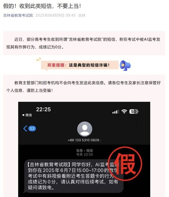近日,多地高考生收到所谓“省教育考试院”的短信,称在考试中被AI监考发现其有作弊行为,成绩记为0分。6月9日,四川、吉林、浙江、天津、海南等地有关部门发布郑重提醒:这是典型的诈骗类信息,扰乱正常考试秩序!教育主管部门和招考机构绝不会向考生发送此类信息。